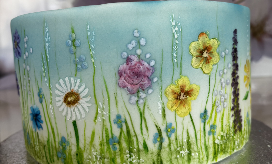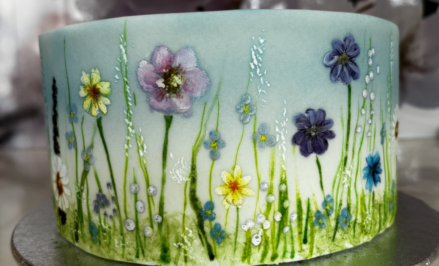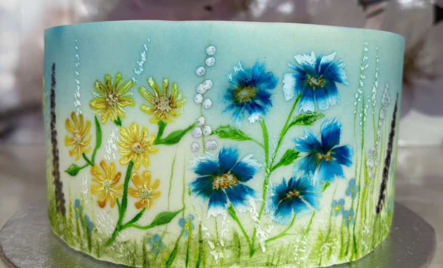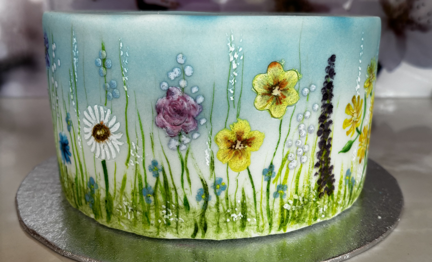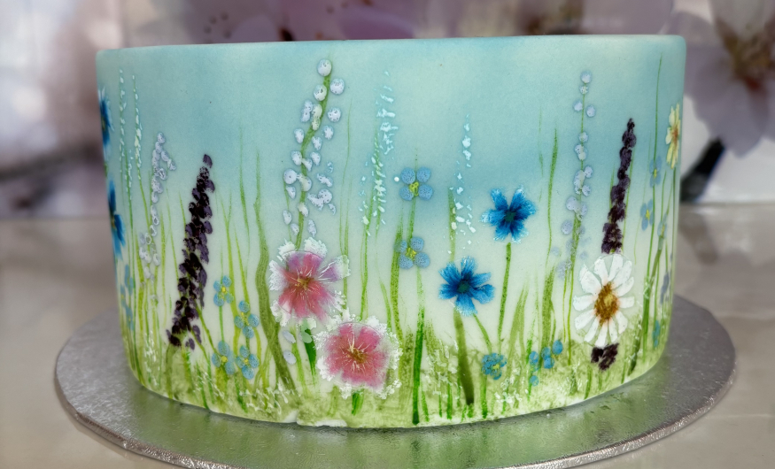 You don't need to be artistic to be able to create beautiful painted designs onto fondant. Under the guidance of an expert tutor, you will be amazed at what you can achieve. In advance we will ice a dummy cake in white fondant for you. During the day you will begin by airbrushing a variety of background scenes - sky, hills etc. Moving on you will paint a selection of floral designs.