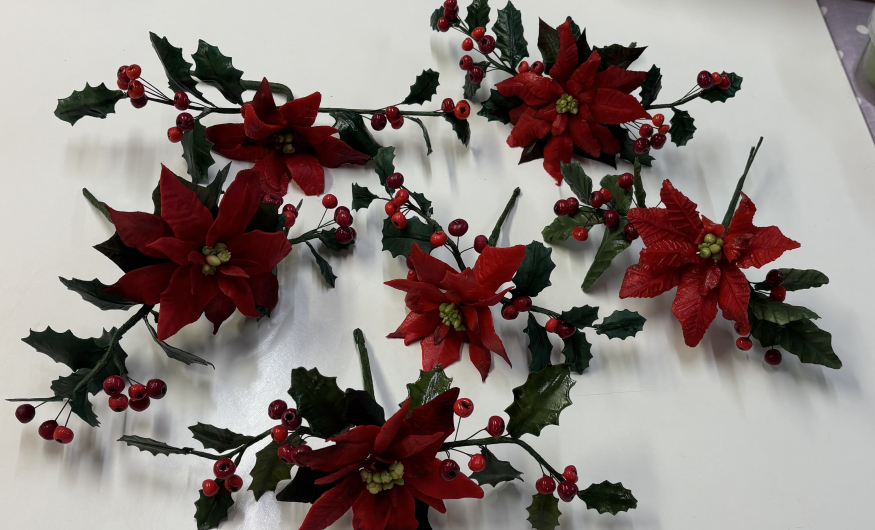 Under the guidance of an experienced tutor you will learn step by step how to create a beautiful poinsettia, holly leaves and berries. You will then learn how to wire these into a spray - all ready to place on your Christmas cake.