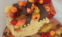 Rustic wicker bag cake with autumnal leaves, flowers and berries